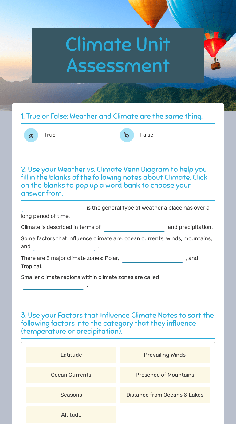 Learn the definition, examples, and different types of … Review the basic causes and consequences of climate … Hand out a copy of the "daily weather data" worksheet to each student. Of interest, climate is one of the five soil forming factors and has a significant influence on the properties of soil. Tell students that each day a different pair of students …